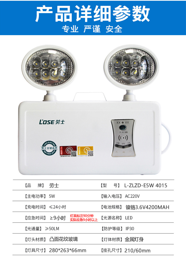 消防 > 消防救援及照明设备 > 双头消防应急灯 > 劳士 应急九小时双头灯 280*263*66mm L-ZFZD-E5W4015