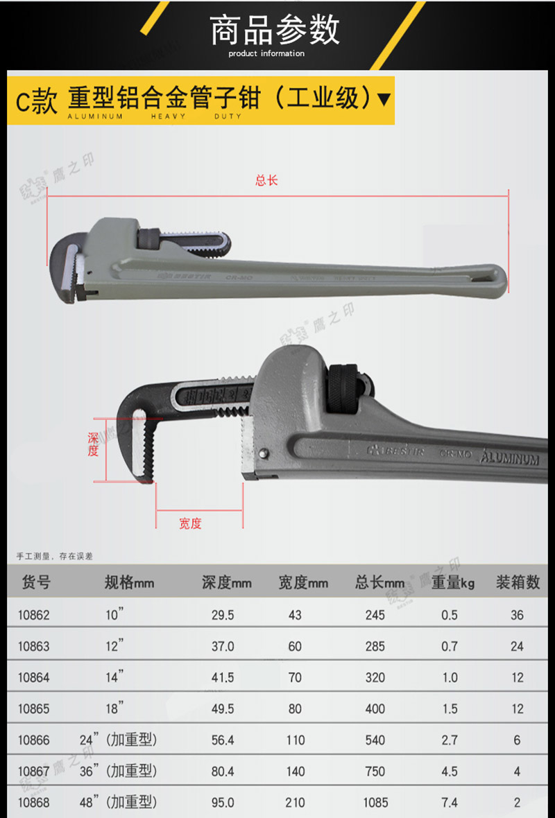 鹰之印 10美式重型铝合金管钳 BST-10862