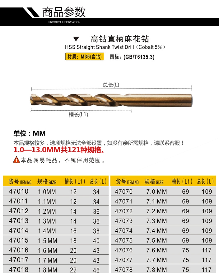 推荐用途应用于不锈钢、模具钢、铝合金、铸铁、铜、镀锌管等金属材质打孔 保质期720天