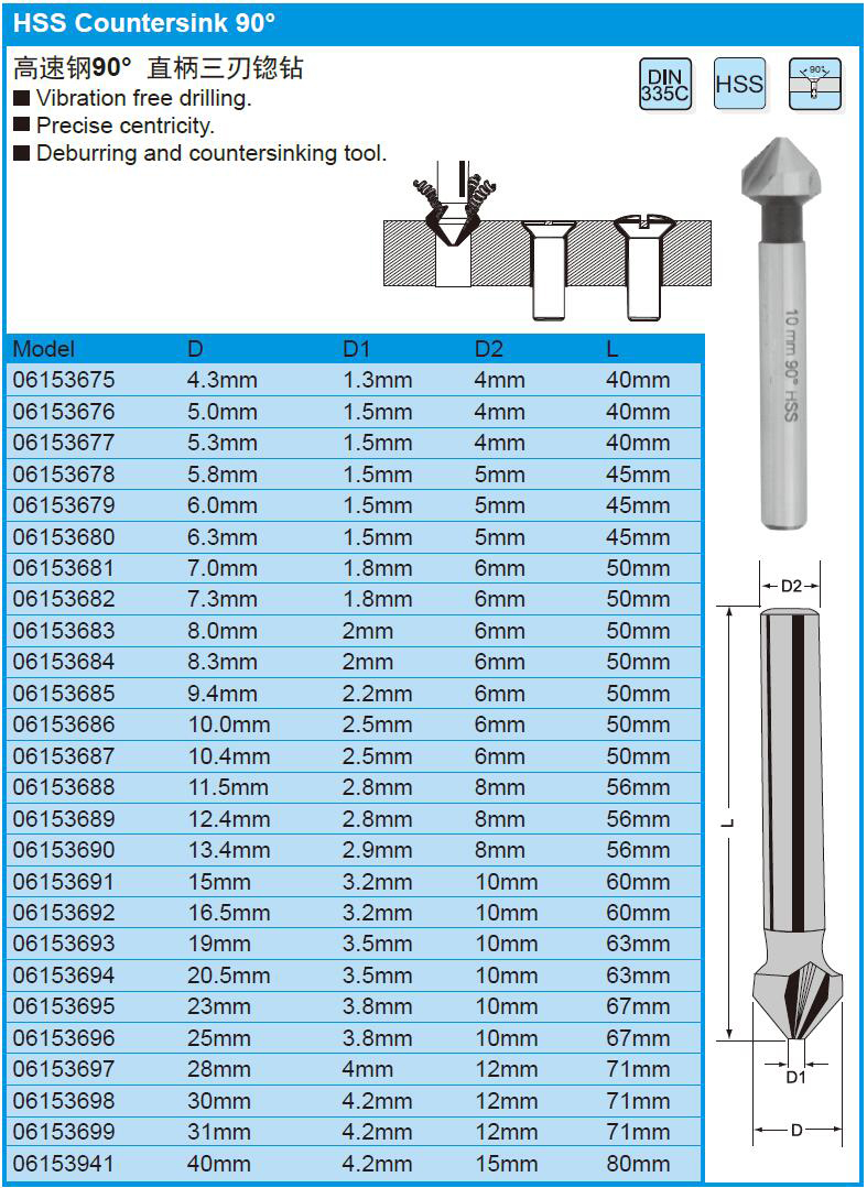 • 高速钢90°直柄三刃锪钻