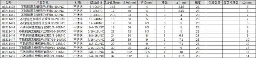 • 不锈钢用直槽粗牙丝锥10-24UNC