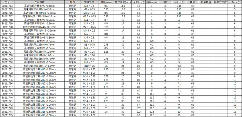 • 高速钢跳牙丝锥M12×1.00mm