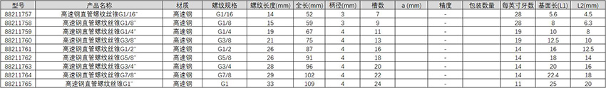 刀具 > 孔加工刀具 > 螺纹刀具 > 高速钢直管螺纹丝锥G1/16"