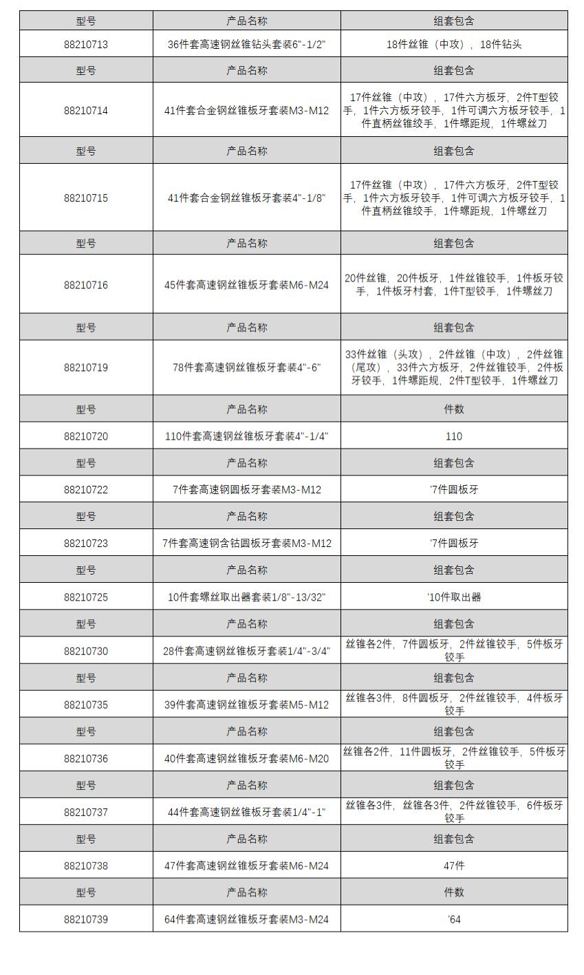 规格丝锥各2件,7件圆板牙,2件丝锥铰手,5件板牙铰手 型号88210730