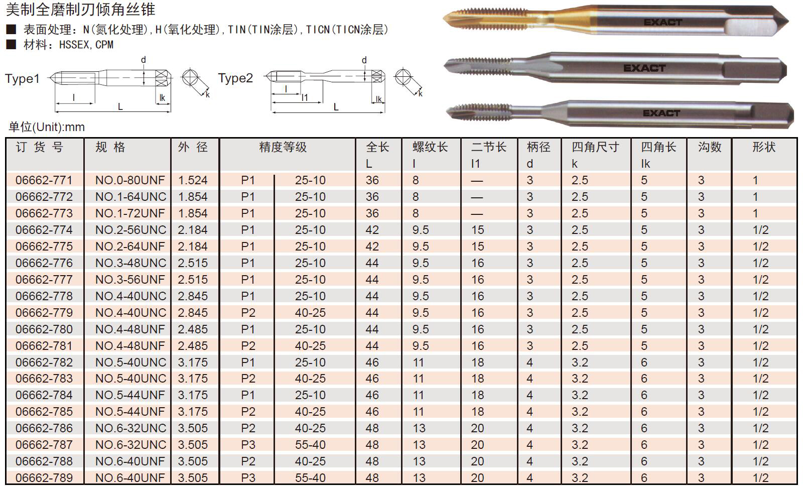 刀具 > 孔加工刀具 > 螺纹刀具 > 美制全磨制刃倾角丝锥