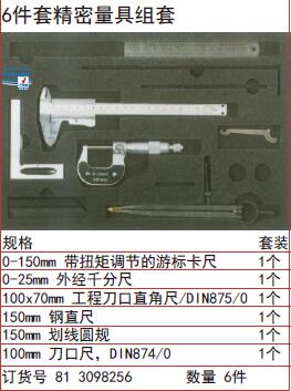 规格0-150mm 带扭矩调节的游标卡尺 1个0-25mm 外经千分尺 1个100x70mm 工程刀口直角尺/DIN875/0 1个150mm 钢直尺 1个150mm 划线圆规 1个100mm 刀口尺,DIN874/0 1个 型号81 3098256