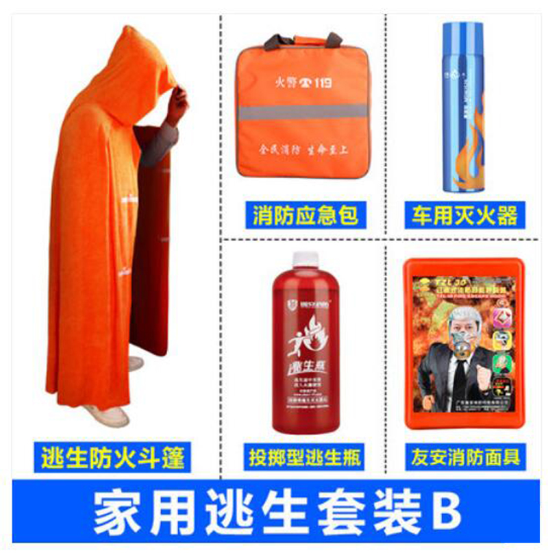 • 消防防火套餐二(逃生防火斗篷、消防应急包、车用灭火器、投掷型逃生瓶、消防面具)
